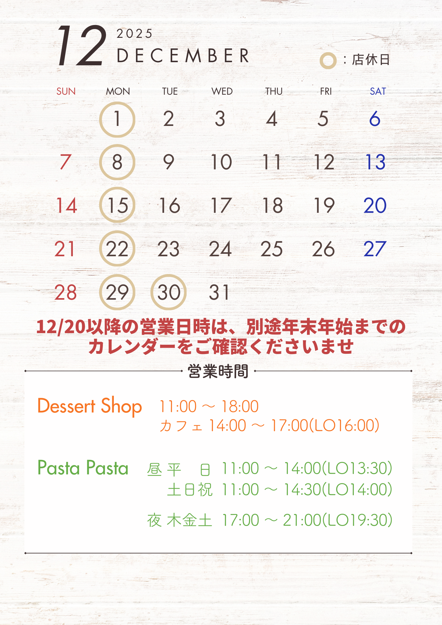 また、同期間は PastaPastaのランチ・ディナー営業時間が変則となります。 年末年始までのスケジュールを表にまとめましたので、ぜひご確認ください✨