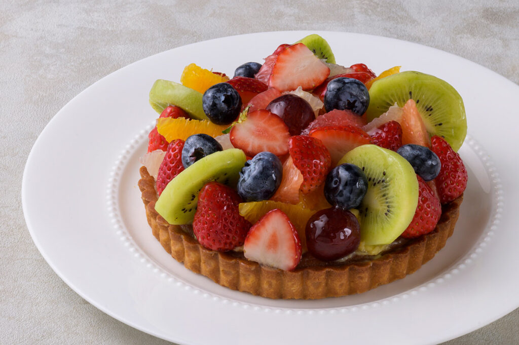 みずみずしいフルーツをたっぷり乗せました。タルト生地は発酵バターを使用。