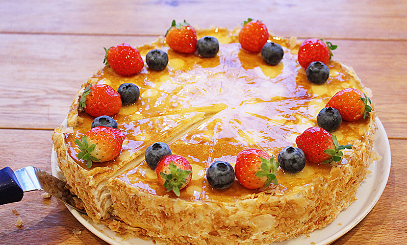 もちもちのクレープの間にたっぷりの苺とえすかるごシューのクリームをはさみました。